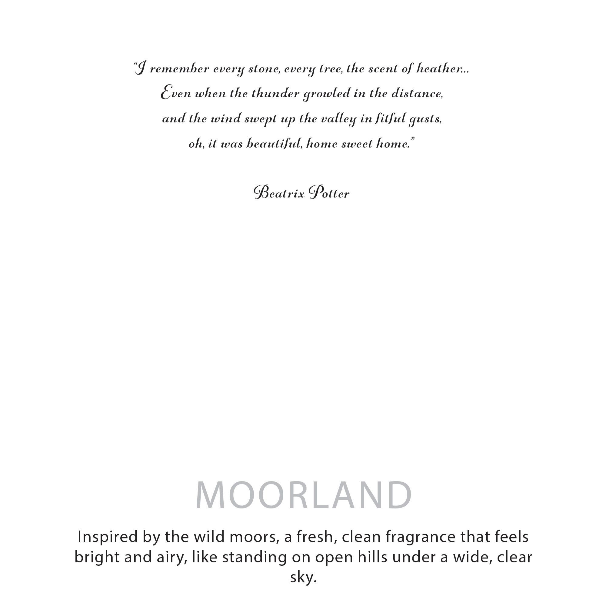 Inspired by the wide, open moors of the Lake District, Moorland is a fresh, clean fragrance that feels light and expansive. It captures the sensation of standing on open hills under a clear sky, with cool air and space all around you.