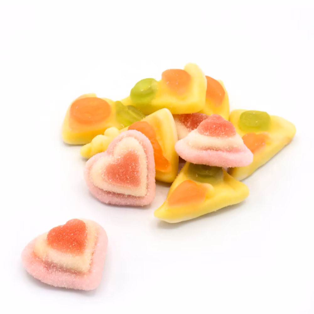 Pizza Slices:Â Glucose Syrup, Sugar, Corn Starch, Beef and Pork Gelatine, Acids (Citric Acid), Fruit and Vegetable Concentrates (Apple, Carrot, Safflower, Spirulina, Lemon, Radish, Pumpkin, Tomato), Gelling Agent (Pectins), Flavourings, Vegetable Oil (palm Oil), Glazing Agents (Carnauba Wax, Beeswax).